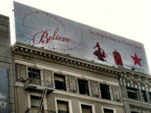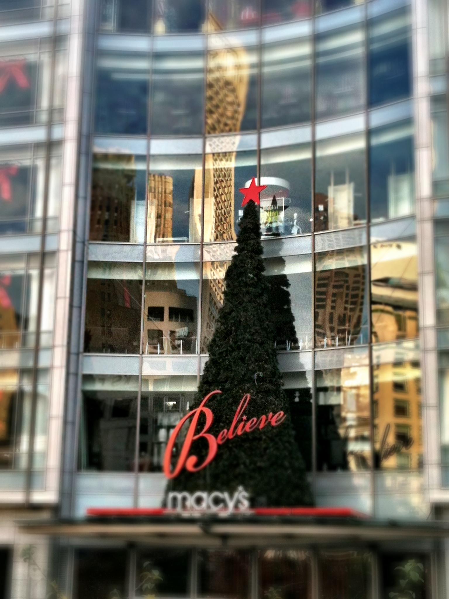 Believe.  It seemed like a mockery at the moment.  What about all the people here that do believe and hope and try, only to find nothing in return.  And on this Christmas Day there it was, taunting those who had nothing left to believe in.  And to make matters worse, I was a bit angry and annoyed that it was on the Macy’s building.  How stupid is that?  What does “believe” have to do with Macy’s?  It seemed like such a dichotomy.  “Believe” is such a deep philosophical word and to have it associated with a commercial for mere “stuff” seemed sacrilegious to me.  Not to mention all the people who can’t even step foot into that store much less afford it.  Believe?