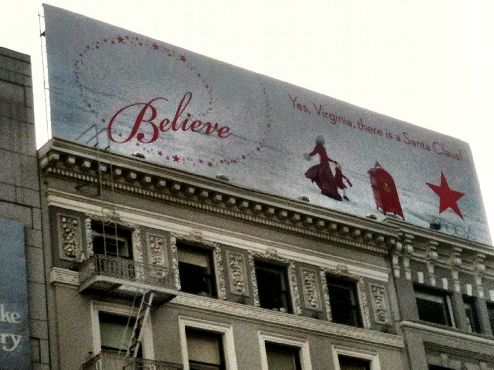 I had just been updating my facebook status, talking about my morning in the tenderloin, and ironically had ended my post with these prophetic words “(don’t save it all for Christmas day…)” (in other words, live every moment with love in your heart towards others),  and not even 30 seconds later, my own words tested me as the man had approached me.  His look lay heavier and heavier on my soul. Even though his presence was gone, I couldn’t shake his soul from mine. We walked into Union Square and sat for a minute drinking our coffee.  I scanned the crowds everywhere, but he was gone – lost in the humdrum of the city.  I wanted to cry.  His desperate, ashamed look kept sinking heavier and heavier upon me. I looked up from the Square and noticed this sign that said “Believe.”