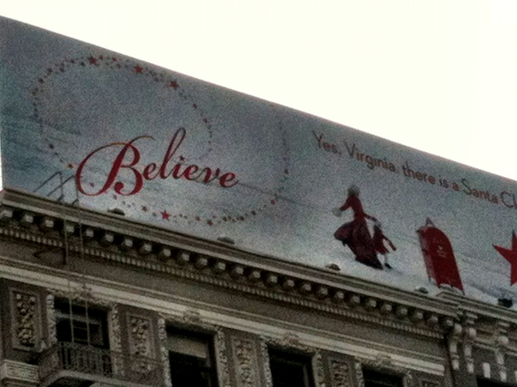 Finally, after what seemed like hours, I spotted Steve making his way towards me. Coffee and sandwich in hand, we waited for the signal to cross the street. The man stood there still, leaning against the cold stone building, watching the people pass by, looking towards all the signs that screamed “BELIEVE.” Finally the light changed and as we crossed the street and got closer and closer, I saw that it wasn’t the same man who had been in Starbucks. He was almost wearing the same clothes, but as we drew nearer I could see his face was different and he was taller. It had been too good to be true… We approached him anyway and Steve asked: “were you recently in Starbucks looking to buy a coffee?” The man looked bewildered and surprised that someone was even talking with him, and finally shook his head, replying “no man, I wasn’t there.” His sheepish smile and clear eyes lifted some of the heavy load from my heart. He then said, “But I could really use something to eat and drink right now,” and so we gave him the sacred coffee and sandwich, wished him a Merry Christmas and told him to spread the love.