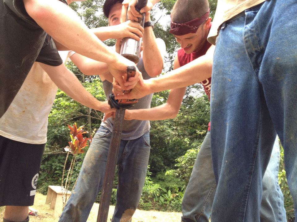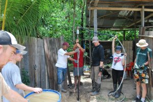 – Connect all the drill pieces, and begin to drill the well, turning it by hand with two monkey wrenches.  This is a tough job and different participants in the well-drilling have to rotate every 10 minutes.